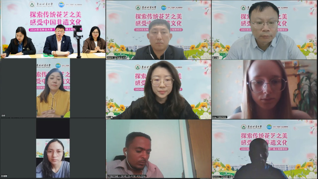 4月15日,由教育部中外语言交流合作中心主办,东北林业大学承办的2024年“汉语桥”线上短期交流项目——“探寻传统花艺之美,感受中国非遗文化”顺利开营。来自俄罗斯、越南、斯里兰卡、巴基斯坦等19个国家的175名留学生齐聚“云端”,参加开营仪式。国际合作处处长孙治平、本科生院教务运行中心副主任陈立钢、国际交流学院院长王博及教师代表出席开营仪式。开营仪式由国际交流学院副院长周学红主持。